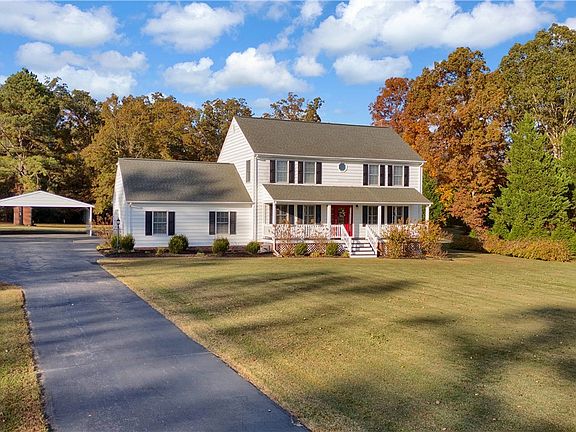 Welcome home to 5170 Scandia Rd in sought-after Sandston, VA. This meticulously maintained 2-story colonial, set on 2 acres of private land, offers an inviting blend of charm, comfort, & modern updates. With 3 spacious bedrooms, 2.5 bathrooms, & 2,304 square feet of thoughtfully designed living space, this home provides the perfect setting for both relaxation & entertaining. Upon arrival, you’re greeted by a freshly painted, full-length front porch that sets a welcoming tone. Step inside to find a foyer that flows seamlessly into a formal dining room & a large family room, where hardwood floors & a cozy wood burning fireplace add warmth & character. The recently renovated kitchen is a chef’s delight, featuring a custom butcher block island & ample counter space—ideal for culinary creations & casual gatherings alike. Upstairs, the expansive owner’s suite includes an updated bathroom & a large walk-in closet, while two additional bedrooms share another beautifully updated full bathroom. A walk-up attic provides convenient storage for all your needs. The sunroom, bathed in natural light & highlighted by striking tongue-and-groove ceiling, adds a unique charm, blending colonial elegance with modern comfort. Recent updates include a new composite rear deck & a freshly laid concrete patio, creating an ideal outdoor oasis. The backyard offers tranquility with raised bed gardens for growing your favorite plants, an attached 2-car garage, a carport, & additional storage sheds equipped with newly laid electric. Whether you’re enjoying morning coffee on the front porch or hosting friends on the rear deck or patio, this home promises a lifestyle of peace, comfort, & timeless beauty. Don’t miss the opportunity to experience this exceptional home—schedule your visit & make it yours today!