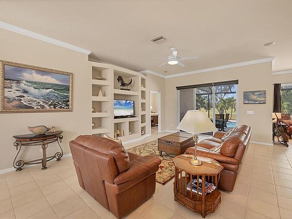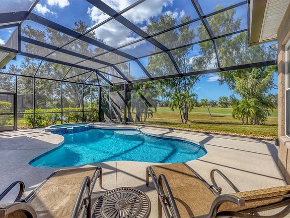 Exceptionally rare opportunity in the notable Estates at Glenn Lakes! This updated, highly sought-after residence sits proudly on the 9th hole of the Manatee County Public Golf Course, offering picturesque views & an enviable lifestyle without the mandatory Country Club membership fees. Boasting nearly 2,000 square feet of living space is meticulously maintained, open concept living space. This home features 3 spacious bedrooms plus a dedicated den/office, perfectly catering to modern work-from-home needs. A seamless flow connecting the living, dining, and kitchen areas creates an ideal environment for entertaining and daily life. A truly unique and seldom available 3-car garage provides ample storage & parking. Peace of mind with new Roof & AC in 2021, new pool heater in 2024, re-marcite of the pool & spa in 2025. Superior Hurricane protection equipped with Low E rated Impact windows throughout plus additional hurricane shutters and garage lockdown braces for maximum safety & energy efficiency. The Estates at Glenn Lakes is a deed-restricted community known for its full-time resident atmosphere? Not a transient vibe. Rental minimums are set at six months to preserve the neighborhood's tranquility. Enjoy effortless living with low monthly HOA fees that conveniently cover weekly lawn care & irrigation allows you to spend time enjoying the Florida Sunshine. While the property is not currently in a flood zone, its location provides easy drive to the Gulf Beaches. Also, within close proximity to World renowned IMG Academy, dining, shopping arts, Sarasota/Bradenton Airport as well as a scenic ride to the culture & big-city amenities of St. Pete & Tampa. Don't miss your chance to own one of the rarest offerings in the Estates at Glenn Lakes.