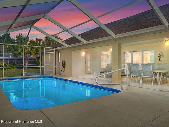 This Is The One! A Really Nice Pool Home. Move-in- ready 3 bedroom, 3 full baths, with oversized 2 car garage. Located on the Oak Hill Public Golf Course! A hidden gem neighborhood that shows pride of ownership. No HOA/CDD fees! This barely lived in vacation home comes fully furnished for sellers convenience. Enjoy an open floorplan with a relaxing feel. A beautifully tiled kitchen with a side-by-side refrigerator, overlooks the main living area. Relax in open Great Room while enjoying the view of your pool and the golf course. Natural light shines through this huge master suite with lots of windows and a door to lanai, walk-in closets, relaxing Jacuzzi tub, separate tiled shower, double sink vanity and linen closet. Spacious pool bath with shower/tub combo. You'll love this charming guest suite with an en-suite bath and large walk-in closet. All Appliances Included. No value given to personal property (can be donated to local charity). Pool pump replaced 2018, Some photos of grass were digitally enhanced. Please check out the floor plan and video.
