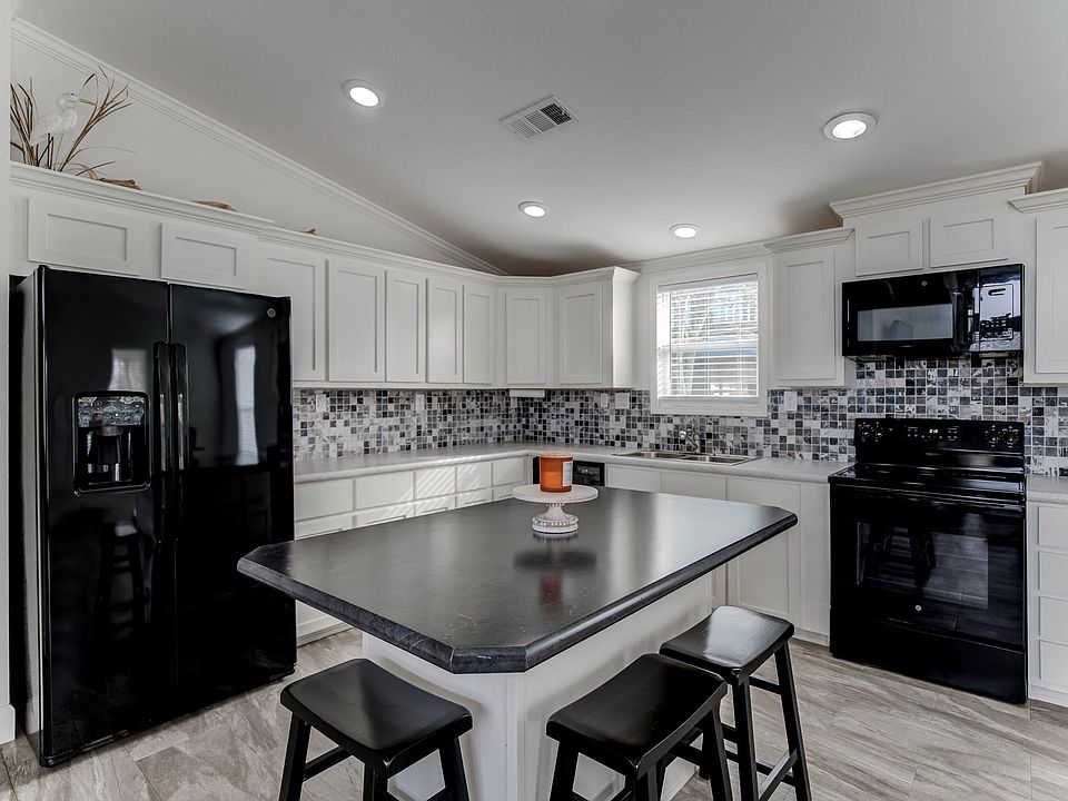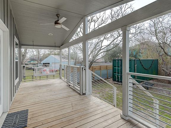 Discover coastal living in this charming 2-bed, 2-bath home near Galveston and Trinity Bay. Nestled among mature trees, it includes a Conex storage shed and a converted studio with electricity, perfect for a workspace or guest suite. The open-concept living area features large dormer windows in the living room, filling the space with natural light. The island kitchen offers an electric range, breakfast bar, tile backsplash, and a walk-in pantry, seamlessly connecting to the dining and living areas. The serene primary suite boasts dual sinks and a walk-in shower. Enjoy the sea breeze from the covered porch with a porch swing. For privacy, the home faces the backyard and studio. This Smart Home includes a SimpliSafe security system, app-controlled thermostat, and keyless entry. Built in 2021, it features a cement foundation and custom skirting, an upgrade that sets this home apart. Located off Hwy 146, near Galveston, Kemah Boardwalk, Tanger Outlets, and marinas. Zoned Dickinson ISD.
