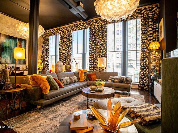 Welcome home to this stunning condo in the center of vibrant downtown Macon! This professionally decorated home will sweep you off your feet the moment you walk inside as the fixtures are art themselves. Upon opening the front door you'll find a beautiful hallway adorned with trompe l'oeil marble, historical sliding doors, along with gold leaf sconces to illuminate your path. Rounding the corner, you'll find an open floor plan with floor to ceiling windows and draperies overlooking exciting Cherry St, complete with privacy screens so that you can take in the night life or put it to rest as desired. Two magnificent cloud chandeliers and 15' ceilings invite you to dream and live big in Macon. The kitchen features top of the line appliances, marble countertop and a back-lit onyx wet bar, another new feature to what was once a bland space. This condo has two bedrooms with their own ensuite bathrooms plus a half bath; whether you are entertaining for the weekend or just for dinner your guests will feel steeped in luxury. If you are looking for Big Apple living in the Cherry Blossom Capital you've found it here!