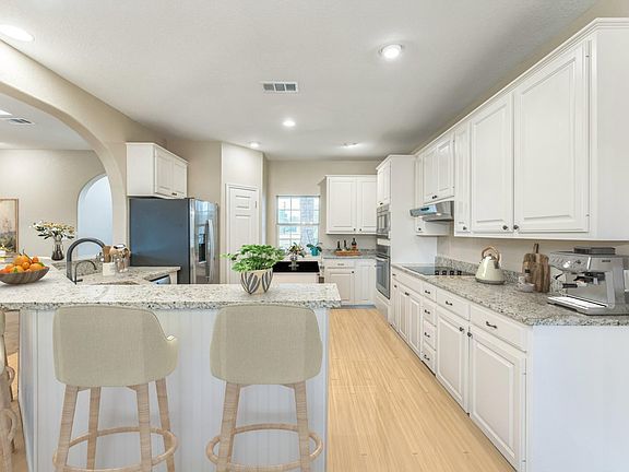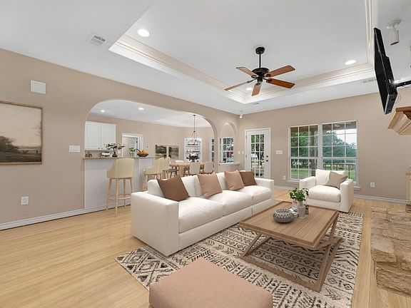 Stunning stone wood-burning fireplaceShady treesHot tubOpen floorplanFreshly painted cabinetsLarge covered patioStainless appliances