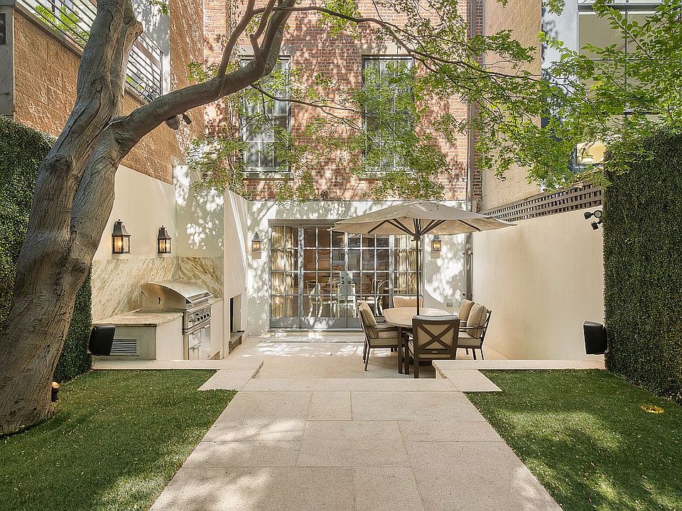 The garden level serves as the true heart of the home. Here, a large, eat-in kitchen with abundant cabinetry, high-end appliances, and a wine fridge anchors the space. South-facing glass doors open to a private backyard, complete with a fully equipped outdoor kitchen and landscaped setting for al fresco dining. Adjacent to the kitchen, a media room offers a relaxed space for lounging or movie nights while maintaining a seamless connection to the outdoors.