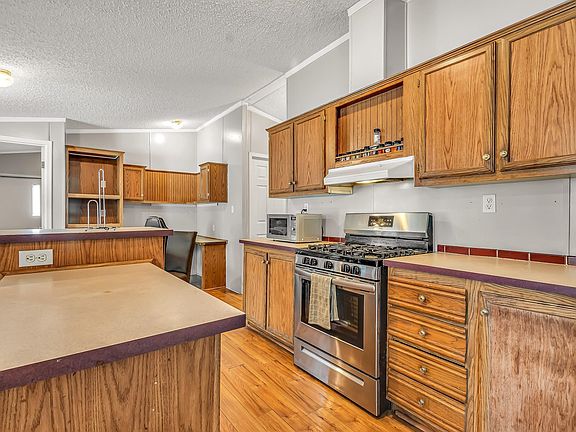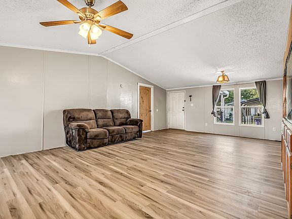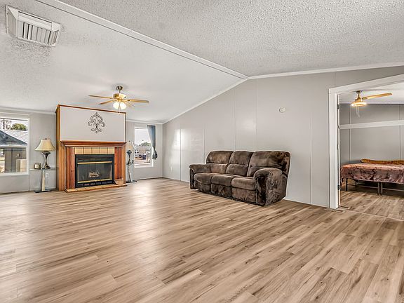 Large double wide manufactured rancher on a large corner lot with a fully fenced backyard. Open floor plan and very spacious. Home has been recently re-painted and decks totally redone. Large kitchen with bar and many cabinets. Walk in pantry. Over sized living room with a gas fireplace. 10 X 13 storage shed with a 2 car carport. Park has additional RV and trailer space.