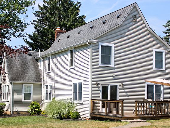 Charming, spacious colonial, with impeccably designed 2004 addition, features 4 large bedrooms, including master with sitting room and walk in closet. The 2007 kitchen features Kraftmaid cabinetry with country french finish, granite counters, breakfast bar, stainless appliances, and opens to large family room with slider to deck. First floor also includes full bath, den, formal living and dining rooms, powder room. Original features include arched doorways, hardwood floors, wall sconces, oak staircase, extensive molding. Enjoy central air and ceiling fans in the summer, and a cozy woodburning fireplace in the winter. Exterior features dimensional roof, vinyl siding, replacement windows throughout, plus 3 car garage, .39 acre landscaped property.