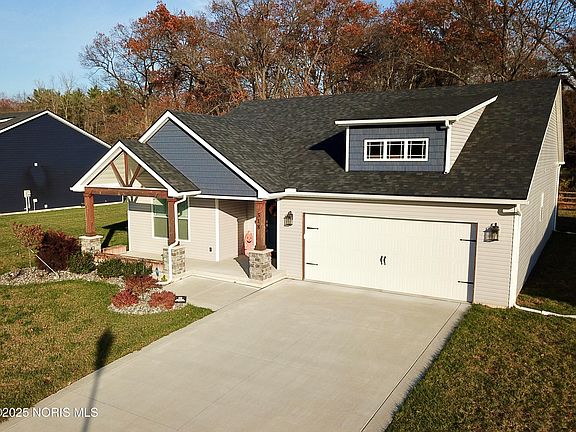 Welcome to this beautifully maintained ranch in Hidden Village, offering modern style and thoughtful upgrades throughout. The spacious kitchen features a center island with quartz countertops, stainless steel appliances, a stainless range hood, and Kraftmaid soft-close cabinets. The kitchen flows seamlessly into the inviting great room, complete with built-ins and a gas fireplace - perfect for everyday living and entertaining. The split-bedroom layout provides ideal privacy, with the primary suite offering a walk-in closet, dual sinks, and an enclosed water closet. A partial basement provides excellent storage and is ready to be finished to your needs. Enjoy the peaceful setting and the comfort of newer construction in a sought-after neighborhood. Don't miss this one!
