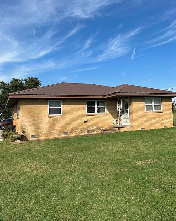 Did I mention 2 Living Areas? Welcome to 518 N 15th, Thomas, OK, a 3-bedroom, 2 full bathroom brick house situated on a corner lot with much loved landscaping. Large Kitchen separates the 2 Living areas, making entertaining possible in both areas with easy access to the Kitchen! This home features both a large living room and a den with a free-standing gas fireplace perfect for gathering friends & family on those chilly OK evenings. The kitchen area boasts a gas cook stove, essential for those inopportune times when stormy weather should occur. Storage space abounds here, and the refrigerator remains with the house. An Abundance of natural light enhances several of the bedrooms. There is a small covered patio area on the North side of the house addition, perfect for sitting and enjoying that morning cup of coffee. This addition features easy care vinyl siding and the back door on the South side has a small covered patio that leads to the detached double car garage with a matching metal roof. Newer double pane windows and laminate flooring update this move-in ready house. A large mature paper shell pecan (perfect for holiday baking!) tree graces the backyard area.