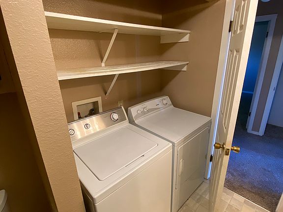 Upstairs apt with deck, washer & dryer in unit, assigned carport spot, two hallway closets, ceiling fan, carpet and vinyl floors, 8 unit complex, close to shopping, freeway access, school, park. Water/sewer/garbage paid by owner No smoking inside unit One assigned carport spot No pets One year lease Reusable tenant screening reports not allowed