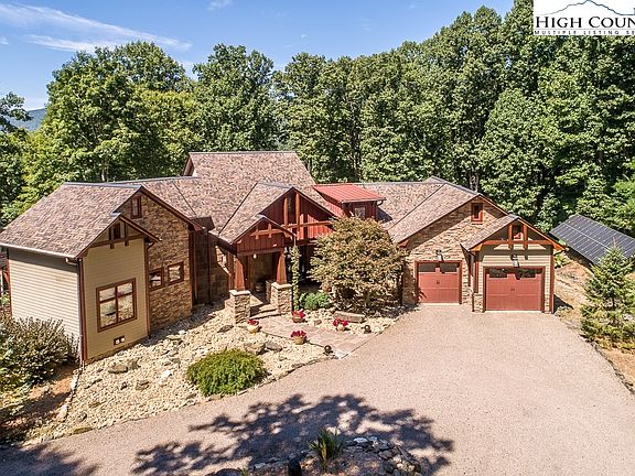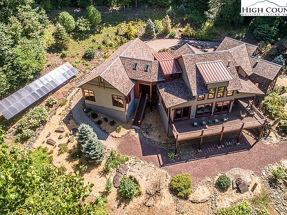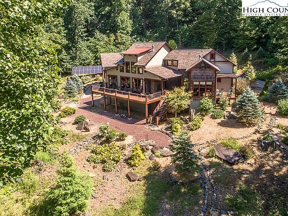 A True Mountain Quintessential Estate Property situated roughly in the middle of 79+ acres, with layered views of hardwoods, 3+ acres of pasture, trails, & a stream with waterfall. Elegance, Quality & Craftsmanship are abundant with high end modern conveniences throughout. SkyBest fiber, CAT5 wiring, 3 Wireless APs + Four Zone Sonos indoor/outdoor sound system, a work from home paradise. Wonderful Floor plan with a great flow. Stunning great room, with floor to ceiling stone fireplace, timber frame accents, high-end open kitchen, with stone & marble counters, pro grade SS appliances, including Thermador induction cooktop, double oven & separate refrigerator & freezer units & large pantry. All 3 BR's including primary are on the main level, & all with en suite baths. Primary suite on one end of the home, with fireplace & home office, WIC with custom built-ins & shelving. Fully renovated master bath in 2023 with heated flooring & luxurious walk-in shower. Just off primary suite is a private porch with pergola & access to outdoor fireplace on deck. Large back deck with great views, IPE decking & stairs, cedar railing, all recently stained. Upper level offers TV room/loft area & additional room that would make a great home gym or artist studio. Easy care wood, tile, & cork flooring throughout. Additional amenities include Owens Corning Duration roof installed in 2021, geo-thermal heat pump, with hydronic floor heating as well as forced air. Propane generator with auto transfer switch & solar power. Extensive & mature landscaping, oversized garage with a 10'ft door to accommodate a larger vehicle. Large Walk-in basement with workshop & additional storage. Protected conservation land with allowance for hunting, add'l homes, guest homes, out buildings, + ability to sell 3 buildable tracts. Tons of wildlife, could also be a great horse property, & the New River access is nearby. Great year-round access & centrally located between Boone & West Jefferson. See today!!