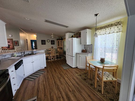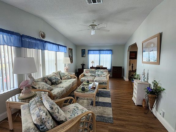 Enjoy this charming 2-bedroom, 2-bathroom home officering a large and comfortable living space with all the furnishings included. Recent updates have enhanced both style and functionality. The metal roof was installed in 2021 and ensures durability and longevity. The property has a convenient 1-car carport added in the same year, providing sheltered parking and a driveway big enough to accommodate a second vehicle. The home has new luxury vinyl planking that adds a luxurious feel to the interior. The air conditioning unit, installed in 2020, ensures year-round comfort. The kitchen has a newer microwave and an upgraded laundry room for added convenience. Sit and enjoy the beautiful Florida weather on the screened lanai, while taking in the flowers and fresh air. This home consists of a workshop/shed for additional storage or workspace. This inviting home is move in ready and waiting for new owners. The base lot rent is $745/mth plus an additional $48.70 for lawn mowing, garbage, Ad Valorum and Non-Ad Valorum Taxes; you will have the benefit of use of all common areas such as the community pool, community center, shuffleboard, and dog park. Storage area for RVs, Vehicles, Trailers/Boats $53.00 per month. Come see what this community has to offer.