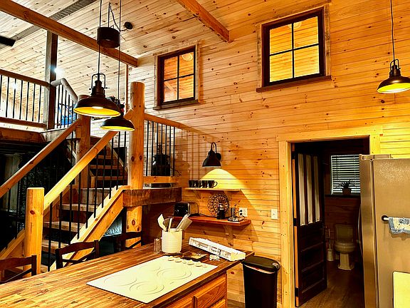We converted the Dry Run store, a cement block building, into a lodge with a wraparound porch, loft, modernized electrical and HVAC systems, and kitchen. The store was the hub of the community for 60 years but lay empty for over 10 years until we made it into a comfortable home for two or three people. We provide the furniture and cooking utensils. Fiber optic internet is available for $45/month. Water is provided. Electricity averages $150/month. Located on a rural road the front porch views Stone Mountain, an 1860 home and farm, fields, and forests. From the back porch the creek and mountain calm and refresh. The inside has tongue-in-groove ceilings and paneling with rustic barn siding and a patina, metal barn roof wainscoting. The owner provides water. The renter pays the electric, internet, and cable bills. Garbage collection costs an additional $30 monthly with the rent, but will be refunded if garbage is bagged and does not exceed the two garbage can capacity or the one roll-away trash bin capacity. Linens are not provided for long-term guests. Late fees of $10/day apply after the first of the month. Clogged pipes cost a minimum of $500. Don't flush wipes, tampons, pads, paper towels, etc. Only flush toilet paper with a flush. Don't pour any grease or food down the drains. Wipe plates and pans with napkins or paper towels to place the grease and food particles in the garbage. Coffee grounds can be rinsed down the drain. Broken appliances require a $150 copayment from the renter. Issues with plumbing, HVAC, leaks, electricity, or mechanical issues should be reported immediately. Guests may not stay more than 10 days in three months. Extra daily rates of $20/day will apply but longer stays must be approved by the landlord prior to the stay. Please read the lease carefully for additional clarifications and details.