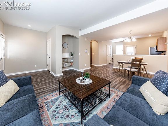 Welcome to this charming townhouse that offers 2,000 sq. ft. of living space with 3 bedrooms and 4 bathrooms. The inviting covered front porch, shaded by mature trees, welcomes you into a spacious open-concept main floor featuring wood laminate flooring throughout the living room, dining area, and kitchen. A cozy nook with built-in shelving adds character, a separate dining space allows for any size table, while the kitchen features a large pantry! A convenient half bath completes the main level. Upstairs, the primary bedroom offers double closets and an attached bath with a tub/shower combo and tile surround. Bedroom two also features a private bath with the same setup. The laundry room is conveniently located upstairs as well. The finished basement includes a third bedroom with a walk-in closet, a full bath, a large living area and extra storage room. Additional storage is available under the stairs as well. Outside, the home has back steps leading to two designated parking spots. Centrally located with easy access to shopping, dining, Colorado Springs airport, and nearby military bases!