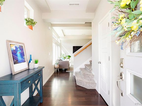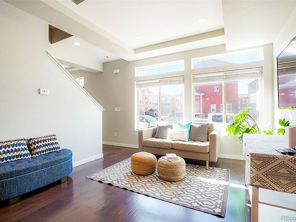 Welcome Home to this sparkling like-new, sunny and bright home in Green Valley Ranch. Enjoy sunsets from your modern rail west-facing porch. The kitchen has an oversize eat-in bar with granite counters and upgraded cabinets. Upstairs you'll find a three bedrooms and two baths with a linen closet and laundry area. The primary suite has a generous walk-in closet. Enjoy mountain views from the spacious third floor loft, which would be a great recreation room, theatre or homework area. This is a corner lot home on a quiet cul-de-sac with brick pavers. It boasts a large patio, private fenced yard and 2 car attached garage. Parks, playgrounds & open space abound with nearby trails and First Creek Park. Walk to Sprouts Market, DazBog and enjoy the nearby Gaylord of the Rockies, NEW Costco, Moonlight Diner and more.