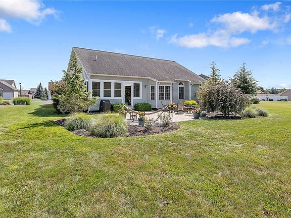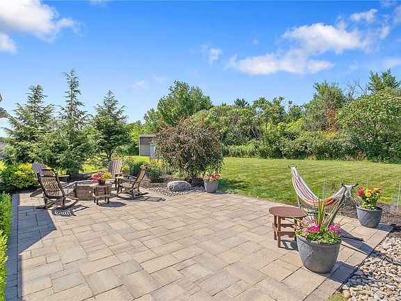 The gourmet kitchen features granite countertops, a breakfast bar, LED lighting, and opens to the vaulted great room with a cozy gas fireplace — perfect for entertaining or relaxing. A bright three-season room overlooks the professionally landscaped yard, complete with a private wooded backdrop, patio, and fire pit, providing an ideal setting for outdoor enjoyment.