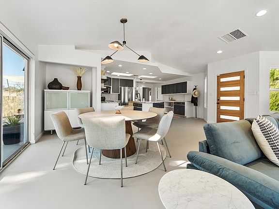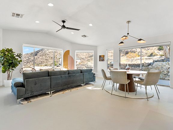A newly successful short term rental situated on eight acres of open space and breathtaking views, this beautifully curated retreat can be your private getaway or the ideal vacation rental. Perfectly positioned in a secluded and peaceful setting, this stunning property has been thoughtfully designed and completely updated. The main home features an open floor plan with refinished concrete floors, new interior/exterior paint, custom front door, electrical and fixtures, kitchen appliances, cabinetry, and terrazzo counters by Concrete Collaborative. A new two car garage and tiny home make for flexible studio space or remote working possibilities.The picture perfect surroundings can be enjoyed from the large windows which also look out to a one-of-a-kind outdoor mural. The outdoor space includes access to its own trailhead, a fire pit, cowboy pool, dining area, and various seating with beautiful mature succulents and trees. This oasis even includes a 250 foot water well with a 2,500 gallon tank and booster pump at 150 feet for water flow efficiency. Vacation rental, event space, quiet escape, whatever your needs, 51889 Canyon is ready to meet them. Located just 20 a minute drive from Palm Springs, Joshua Tree, Pappy & Harriets, and Pioneer Town, this wonderful home is close to everything you need, yet away from it all.