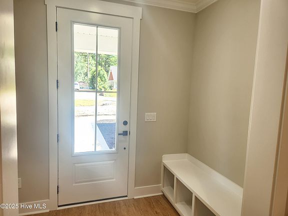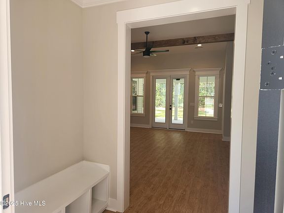 Modern farm house style new construction custom designed home with 3 bedrooms, 2 baths, and a office/flex room located in Carolina Shores North. When entering the home you are welcomed by the foyer with built in cubbies. Located off of the foyer there is a flex room/office in the front of the home. Large living area which features wooden beams in the ceiling and extra windows for more natural light. The kitchen offers quartz countertops, tile backsplash, farm sink, oversized island, and stainless appliances, including, dishwasher, refrigerator, microwave, and range. The all-wood cabinetry comes with easy close doors and drawers. There is a pantry in the kitchen then the hall leads to the oversized laundry room that features built in cabinets and quartz top. The dining area is beautifully finished with wainscotting and crown molding in the trey ceiling. The living area has custom wooden beams in the ceiling with ample room for entertaining and opens to a huge covered back porch. The master bedroom offers a trey ceiling with crown molding and a large walk-in closet. The master bath comes with dual vanities, quartz countertops, and custom tile shower. Master closet has built-in wood shelving. This home has 9' walls with 6' windows, not the standard 8' walls with 5' windows. The home features an oversized 8'x18' garage door, along with gutters. The hot water heater is located inside the oversized garage with extra room for storage.