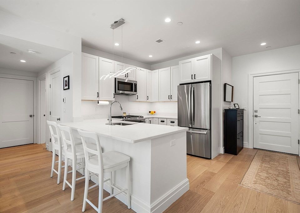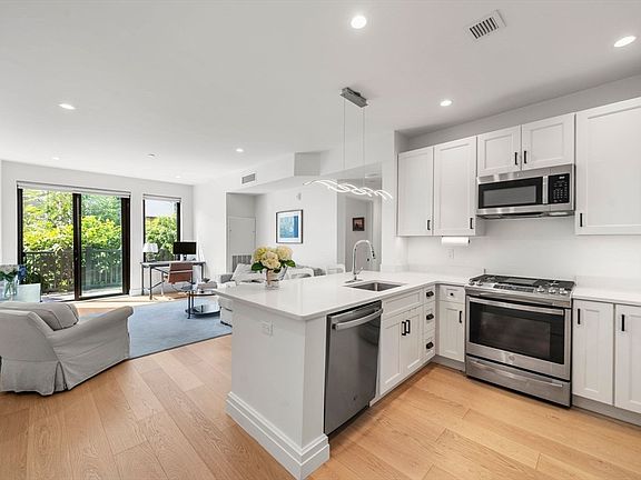 Welcome to Vantage Point, a professionally managed, 30-unit boutique building constructed in 2023. This home offers a perfect blend of modern finishes and thoughtful design. Upon entering, you're welcomed into a bright, open-concept living area featuring an eat-in kitchen equipped with stainless steel appliances, white shaker cabinetry, quartz countertops, and a spacious peninsula, ideal for both casual dining and entertaining. The living room provides ample space for a home office setup and offers direct access to a private patio, perfect for enjoying outdoor relaxation. The generously sized primary bedroom is filled with natural light and offers excellent closet space. The luxurious bathroom includes a double vanity and a fully tiled walk-in shower with glass enclosure. This move-in-ready home combines contemporary comfort with unbeatable convenience in one of South Boston’s most desirable locations. Additional features include a garage parking spot and additional bike storage!