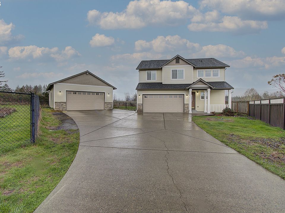 Spacious 3 bedroom, 2.5 bath home on large fenced lot. Open kitchen and dining room. Stainless steel appliances, tile countertops. Wall to wall carpet in living room with ceiling fan. Master with walk in closet, en suite bathroom with jetted soaking tub. Covered deck. Detached 2 car garage. Additional shed behind detached garage.