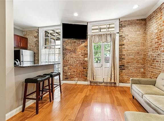 Covered balconyHardwood floorsHigh ceilingsExposed brick