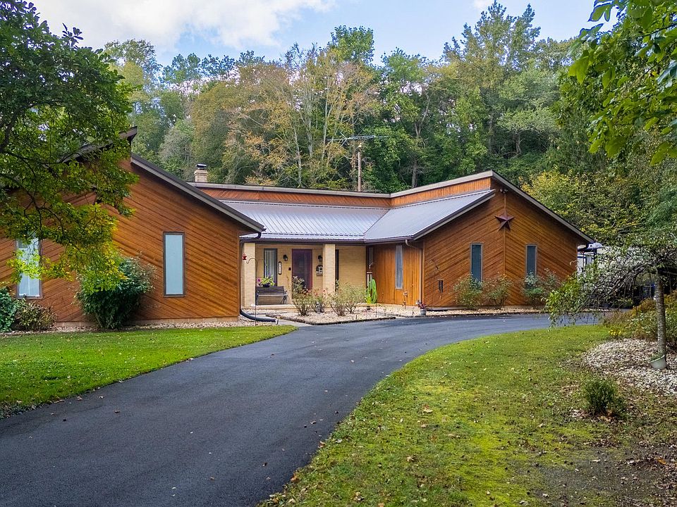 Well maintained cedar ranch home on 5 acres in a country setting. The home is set back from the road with a circle driveway, plenty of parking and shaded by beautiful mature trees. As you enter the home you will feel you have entered your own mountain lodge. To the right you will find three bedrooms, and a laundry room. The main bedroom has its own ensuite and large walk-in closet. The spacious living room has a vaulted ceiling that opens to the kitchen and eating area. The rooms are separated by a floor to ceiling brick chimney with a pellet stove to add to the ambience on the cooler nights. Off the kitchen area you have a Florida room surrounded by three sides of windows allowing natural light. Through the kitchen is a family room that can also be used as an office space and a half bath. This home has 3 bedrooms, 2.5 baths with a separate laundry room. There is a 2 car attached garage, and an additional oversize detached garage that can also be used as a work shop. In the rear of the home is patio for enjoying the well maintained rear yard surrounded by woods and trees. The property also has an oversized three sided pole barn equipped with electricity.