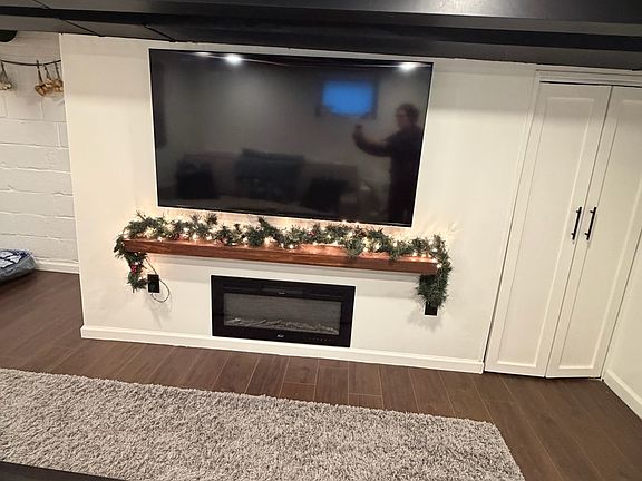 Finished basement with built in bar space and fireplace