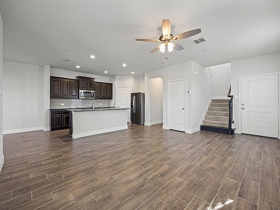 BEAUTIFUL AND BARELY LIVED IN 2 YEAR OLD IMPRESSION HOMES TOWNHOUSE ON THE CORNER OF A CUL-DE-SAC LOT WITH ATTACHED 2 CAR GARAGE! Located in the highly desired Main Street Village, this adorable townhome features almost 2,000 sq.ft! The open concept living, kitchen and dining area downstairs. Step inside to find stunning wood look tile flooring throughout plus several windows allowing natural lighting for added energy savings! Windows open from the inside for easy cleaning and faux wood blinds were an upgrade! AMAZING kitchen boasts HUGE breakfast island with pop up outlet, stainless electric appliances, granite counters, tons of cabinets and massive walk in pantry! Upstairs you will find a small secondary living area which could be a game room, children's retreat or study area. All bedrooms are upstairs including a luxurious primary suite with ensuite bath, awesome walk in shower, spacious vanity with two sinks and fabulous walk-in closet! Secondary bedrooms are spacious and have great closet space too! Laundry room upstairs for added convenience! Step outside to enjoy BBQ's under a extra large covered patio this Fall! Add turf to the green space for an easier to maintain landscape! Front yard maintenance is included in HOA dues! Oversized attached two car garage is a BONUS! This community has a pickleball court and dog park plus additional guest parking! Main Street Village is located about half a mile south of downtown Mansfield offering residents a stellar suburban location with a charming hometown character. Downtown Mansfield features historic storefronts housing local businesses and a variety of dining options. Just a few miles away, larger retail centers like The Shops at Broad provide ample shopping and entertainment. Residents of Main Street Village also enjoy proximity to Cedar Hill State Park and Joe Pool Lake, perfect for outdoor enthusiasts looking to fish, hike, or picnic. Convenient access to highways makes commuting easier too! HURRY!