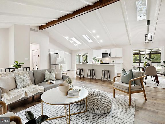 Gorgeous fully renovated 4 bedroom , 3 full bath home in Woodcrest! Open kitchen with white cabinets, quartz counters, stainless steel appliances, large kitchen island with seating for four. Cathedral ceilings with skylights, luxury vinyl flooring, and wood burning fireplace. Dining area with sliders to sun room. Primary bedroom with en-suite bath with stand-up shower. Two additional bedrooms and hall bath with tub/shower. Huge walk-out lower level family room with second fireplace, fourth bedroom and additional full bath. Spacious laundry room and two car garage. Lower level patio and flat back yard...great for entertaining! This home is beautiful!