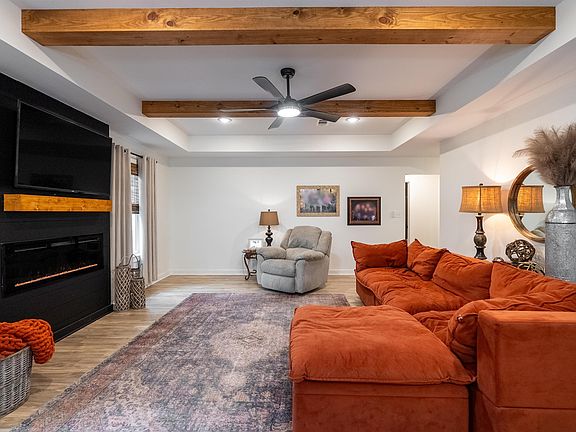 Horizontal wood privacy fencePrimary suiteWood ceiling beamsModern led electric fireplaceBlack granite counters