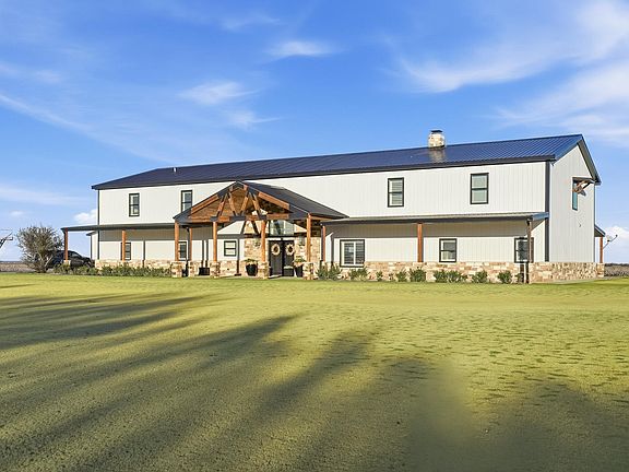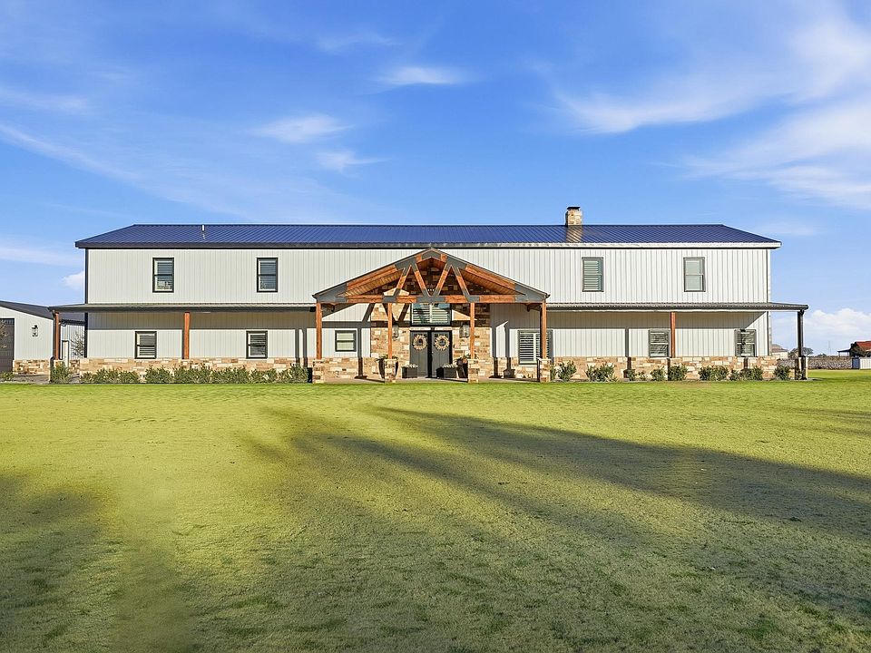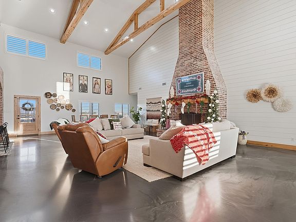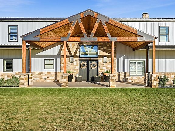 Welcome to your Texas dream home, a private gated entrance where luxury meets wide open spaces on 3.43 acres of pristine TifTuf Bermuda grass, fully irrigated by well water. This 5 bedroom, 3.5 bathroom custom home is designed with impeccable craftsmanship and no detail overlooked. Step inside to a split open floor plan featuring gunmetal metallic epoxy flooring and a 26 foot floor to ceiling wood-burning fireplace, creating a warm and inviting atmosphere. The kitchen offers top of the line appliances, custom Rustic Hickory cabinetry, and Quartz countertops. A spacious butler’s pantry offers additional storage, counter space, and a prep sink. The mudroom is thoughtfully designed with six built in cubbies, seamlessly connected to a laundry room equipped with double washers and dryers for a busy household. Retreat to the primary suite, a private oasis featuring an oversized soaking tub, a stylish walkthrough shower, dual vanities, and a spacious walk in closet. The home gym, located above the primary suite, includes rubber gym flooring and a padded turf run. Upstairs, the home office loft comes with custom built ins, while the kids living room connects four equal sized bedrooms with two Jack and Jill bathrooms. Outdoor living is unparalleled, featuring a custom outdoor kitchen with dual stovetops, a pellet grill, Santa Maria grill, sink, refrigerator, and warming drawer. The in ground heated pool and hot tub include tanning ledges on both ends, an automatic pool cover, and a self cleaning pool sweep all conveniently controlled from your phone. Plus, a half bath is easily accessible from the covered back porch, providing convenience for poolside guests. Adding even more value to this incredible property is a 30x50 shop with electricity and an automatic 12 foot door, perfect for storage, hobbies, or a workshop setup.