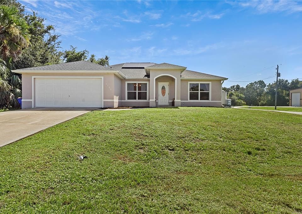 Short Sale. Welcome to this spacious 4-bedroom, 2-bath, 2-car garage home located on a large corner lot in a quiet North Port neighborhood. Featuring an open floor plan with soaring ceilings and nearly 1,800 sq. ft. of living space, this home is full of potential and requires some TLC. The kitchen offers granite countertops, wood cabinetry, stainless steel appliances, and a pantry. The second bath includes a tall vanity, granite countertop, and modern fixtures and room to finish the updates started. Luxury vinyl flooring runs throughout the home for a stylish, low-maintenance touch. Additional features include a spacious laundry room, cost saving solar panels, a welcoming patio perfect for outdoor lounging or entertaining and a cozy firepit where you can relax and gaze up at the stars. Enjoy easy access to local beaches, waterways, golf courses, shopping, dining, and public parks with bike trails, picnic areas, and boat ramps leading to Charlotte Harbor and the Gulf.