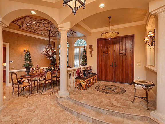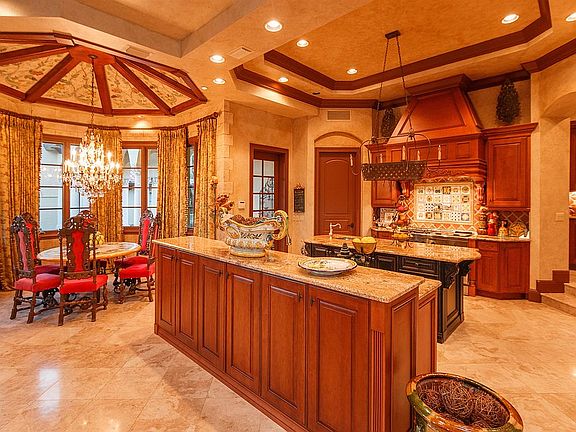 - Interior Features: Ceiling Fans(s), High Ceiling(s), Master Bedroom Downstairs, Central Vaccum, Crown Molding, Walk-In Closet(s), Solid Surface Counters, Solid Wood Cabinets, Eating Space In Kitchen, Kitchen/Family Room Combo, Dry Bar, Wet Bar, Built in Features, Coffered Ceiling(s), Thermostat