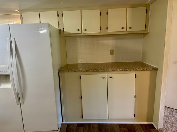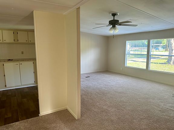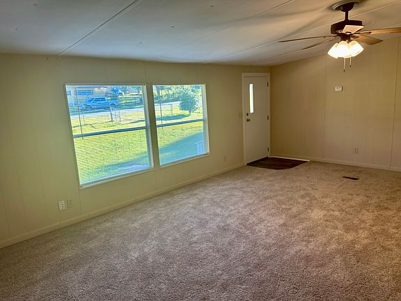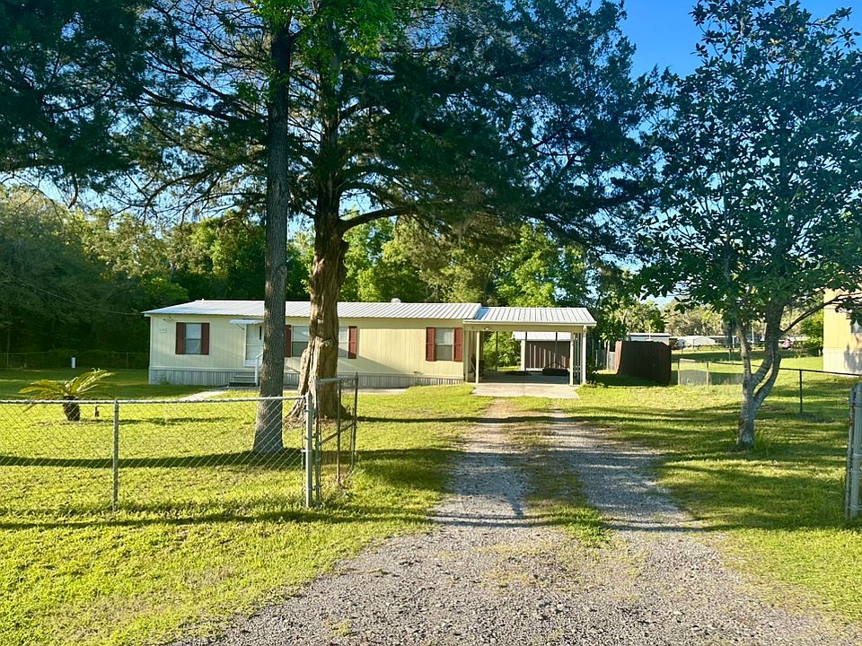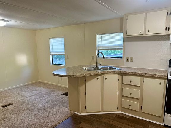 This remodeled double wide mobile home includes new countertops, bathrooms, vinyl kitchen, inside freshly repainted, new carpet/padding with washer/dryer hookup. The property includes ample storage with two sheds and a fenced in yard. The driveway includes a carport.