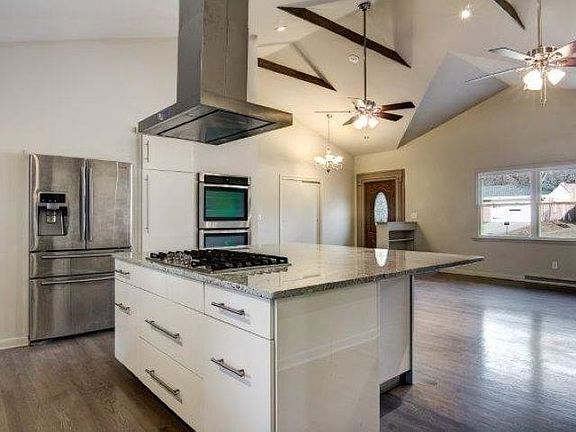 Contemporary home with room to entertain! Open great room floor plan with vaulted ceilings and flexible third bedroom/formal dining. Ikea kitchen with granite counters, center island, gas range, double oven, stainless steel appliances, and pantry. Three full bathrooms, including double sinks in master and family baths. First floor laundry. Lower level rec room with laminate floors, recessed lighting, and tiled bath. Family room with brick fireplace opens to three season room and partially fenced yard. Brick exterior, attached 2 car garage, new windows, and a charming playhouse along the tree line.