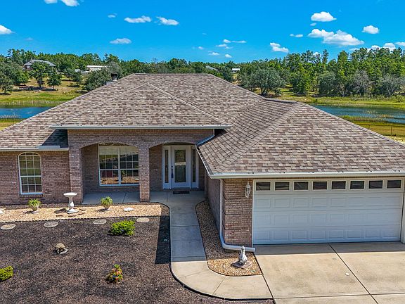 Gorgeous lakefront, brick home sitting on over 4 acres in desirable community! We have the survey and elevation certificate!10ft ceilings with crown molding in living room, wood burning fireplace, double French doors leading to enclosed, heated and cooled Florida room which looks out onto the lake. Split Floorplan. Master bedroom with walk-in closet, blackout cordless blinds, and access to the Florida room. Master bathroom has a double vanity, jetted garden tub, separate shower, and separate toilet. Surround sound system throughout, all new weather stripping and locks on exterior doors. Levelor cordless blinds installed on most windows one year ago. New roof and gutters 2024, HVAC 2022, water heater 2022. New septic field 2023. Two wells, two outbuildings. AquaPro water softener system. Storm Stopper precut and labeled hurricane protection panels for windows. ENSEC Termite bond paid until 9/15/2026.Landscape includes citrus and olive trees, azaleas, & mature oaks all surrounded by a 5ft black vinyl fence. Fish for bass & brim, enjoy wildlife up close! Underground utilities. Quiet neighborhood! Lots of thoughtful improvements throughout! Don't miss out on this beautiful home! Please verify all information and measurements.