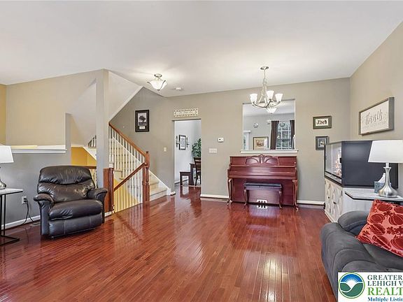 Welcome to this move-in ready townhome located in the sought-after Spring Ridge Crossing community. Enter through the front door into a two-story foyer that greets you into the main level featuring hardwood floors throughout. The thoughtfully designed kitchen offers multiple pantries and abundant storage. A custom-built gate adds a unique and practical touch to the main level layout. Up the two-story staircase, you'll find three spacious bedrooms, including the primary suite with a double door entry, soaring cathedral ceilings, a walk-in closet, and a private ensuite bath. The two additional bedrooms share a full hall bathroom, and the convenient second-floor laundry area adds to the home's functionality. The finished basement is perfect for entertaining or relaxing, featuring built-in surround sound for a true home theater experience. The attached one-car garage includes a 220-volt receptacle, ideal for electric vehicle charging or workshop needs. Recent updates include a new roof and AC unit (2020) and a new hot water heater (2024), offering peace of mind and long-term value. Enjoy all the amenities Spring Ridge Crossing has to offer, including scenic walking and biking trails along the Little Lehigh Stream, fishing opportunities, and the newly updated Spring Ridge Crossing Park and playground. Conveniently located near shops, restaurants, I-78, Route 222, and within a top-rated school district — this is the perfect place to call home!