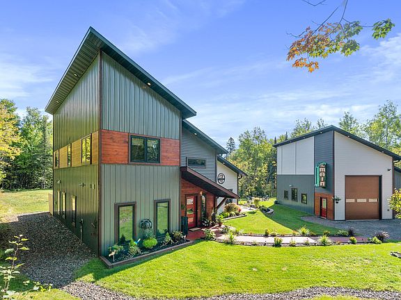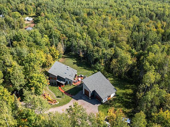 This custom-built 3-bedroom, 4-bathroom home, situated on over 4 acres just a short drive from downtown Duluth, offers the perfect blend of luxury and comfort. As you step through the foyer, you'll be greeted by an open floor plan that seamlessly connects the living spaces, anchored by a cozy wood fireplace. The kitchen is a chef's dream, featuring ample counter space, a breakfast bar, a pantry, and a patio door that invites the outdoors in. The main floor boasts a spacious primary bedroom, complete with a walk-in shower, a vanity area, and direct access to a private patio with a hot tub and an outdoor shower, creating a serene retreat. The convenience of a main floor half-bath and laundry room adds to the home's practicality. Upstairs, you'll find two additional bedrooms, one of which features a charming reading nook, perfect for relaxation. The large full bathroom and den provide extra space for family or guests. Outdoor living is a highlight, with a large patio ideal for entertaining, complete with a built-in grill and a fire pit for those cool evenings. The property also includes a heated, insulated 4+ car garage that doubles as a workshop. This garage is fully equipped with a ventilation system, a kitchenette, a 3/4 bath, and a loft area with a pool table, sitting area, and bedroom. This home is truly one-of-a-kind, offering unparalleled amenities and a peaceful setting just minutes from the city.