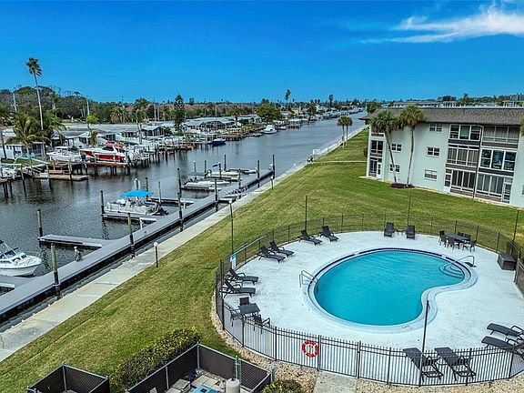 Enjoy the Florida waterfront lifestyle in this well-maintained 2 bedroom, 2 bath condo located in a desirable waterfront community of Windward Cove just 2 miles from downtown New Port Richey. Situated on the second floor, this residence features a bright and open living area with an enclosed porch, perfect for relaxing year-round. Primary Bedroom features walk-in closet and on-suite Bathroom. Spacious 2nd Bedroom located next to Guest Bathroom. Eat-in Kitchen with inside Laundry. Reserved covered parking space. The community offers a private pool and a community boat dock with access to a Gulf-access canal. Walk to nearby restaurants and shopping, with easy access to area attractions. Conveniently located approximately 45 minutes from Tampa International Airport and about an hour from downtown St. Petersburg. HOA fees include cable, internet, water, trash, exterior maintenance, and ground maintenance, providing low-maintenance living. Optional membership available to the Gulf Harbors private beach. Ideal as a full-time residence, seasonal retreat, or investment opportunity. This Condo is priced to sell, schedule a private showing today.