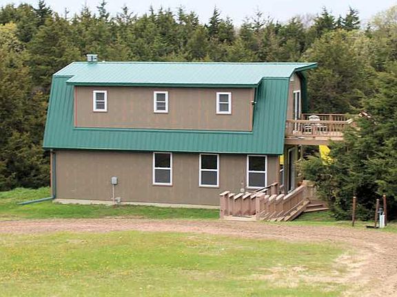 This is a fantastic recreational property that has a lot to offer. The property includes a very nice home cabin large shop spring fed pond 20 acres of alfalfa and great hunting. The property also was designed to live completely off the grid by utilizing modern wind and solar systems The four bedroom one and one half bath two story cabin was built new in 2012. The current owners have lived full time on the property. The cabin has upper and lower decks overlooking the nearby pond. It has a theater style tv projector with screen built in the ceiling surround sound and an Onkyo receiver. The cabin has many extra features including antique bedroom doors custom shelving around two bedrooms and cedar and hackberry wood wall coverings.The propane refrigerator and stove are included. The heating cooling system includes propane morning stoves up and downstairs and window a c. You can also stay connected or catch up on work from home if needed as the property is served by high speed fiber optic internet through Great Plains Communications.The shop is 64 x54 with an additional lean to for storage. The building is completely insulated and heated with propane tube heaters. You will also enjoy spending time in the man cave finished within the shop building.The complete off grid system included 20 solar panels new in 2017 a wind turbine system updated in 2018 a battery building 16 330v batteries in 2018 and a back up Koehler propane generator providing power when needed new in 2017 . The entire power grid system can be monitored from inside the cabin. Image living without an electric bill The property is served by a professionally installed security camera system with laptop recording and smart phone monitoring capabilities.The surrounding land consists of approximately 20 acres of alfalfa currently rented on 50 50 shares. In the evening you can sit around the fire pit in the gazebo next to the spring fed pond stocked with bass bluegill and crappie. The small spring fed stream flows through the pond and down through the tree lined canyons. The abundant deer and turkey population feed on strategically placed food plots and can be viewed from a permanent deer stand blind. Other improvements include 52 black walnut trees planted in 2018 and a new driveway graded and rocked in 2018.This is a great little property with good access all the modern comforts and lots of privacy. Call for complete details