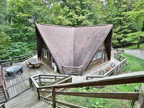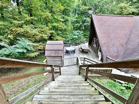 Welcome to Hide-A-Way Hills! A gated community with tons of amenities incl multiple lakes, golf course, clubhouse, wellness center, horse barn, restaurant, pool, tennis/pickleball courts, trails, shooting range & organic garden! This impressive 3BR is nestled on a nearly 1 acre lot & offers fun architecture, newer laminate flooring, tons of light & open floor plan. Spacious living room w/ electric pellet stove. A wine fridge, SS appliances & breakfast bar highlight the kitchen. 1st fl primary suite w/ dedicated bath! Large 2nd bedroom & full bath on entry level. 2nd fl loft & add'l bedroom & flex space. Enjoy scenic views from wrap around deck overlooking gorgeous wooded hillside! Add'l storage & utility sink in basement. Oversized 2-car garage w/area for workshop. WH 2023 & HVAC 2022.