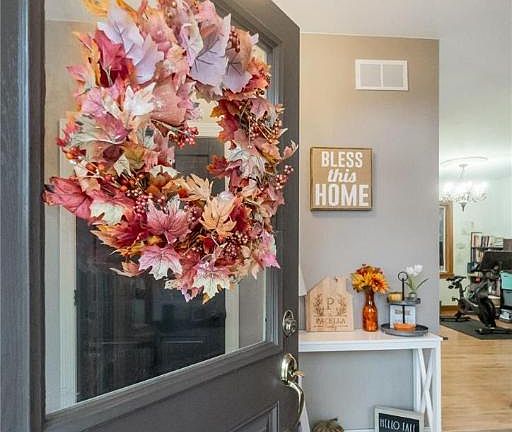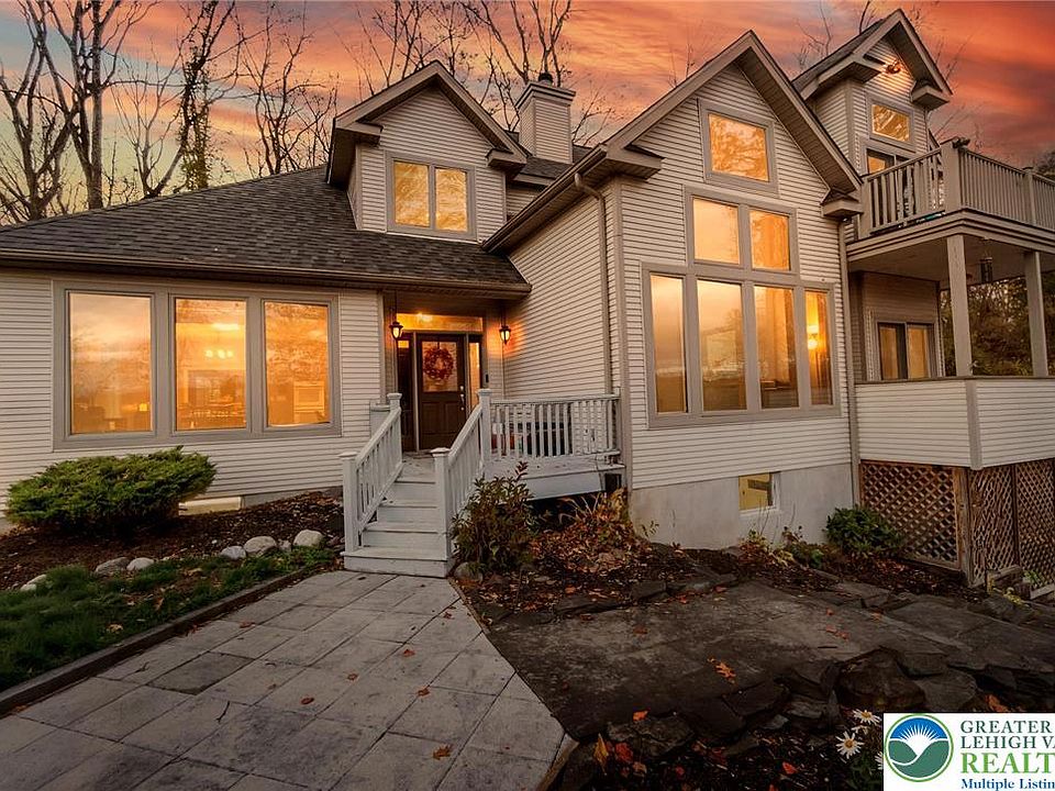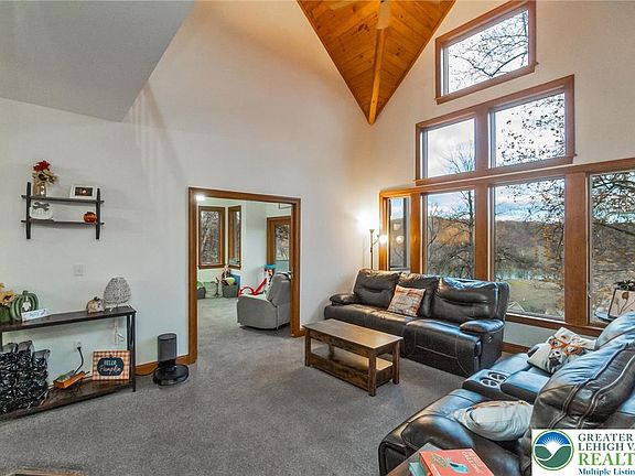 Don’t miss this stunning, beautifully maintained contemporary home that perfectly blends style, comfort, and warmth! The sun-filled living room welcomes you with its soaring cathedral knotty pine ceiling, see-through wood-burning fireplace, dual pocket doors, and wall-to-wall windows that fill the space with natural light. New roof in 2024. New furnace in 2025 and so much more. The spacious eat-in kitchen is a true centerpiece, featuring granite countertops, a large island with pendant lighting, custom wood cabinetry, subway glass tile backsplash, a 5-burner propane stove, and pantry w/ built-in shelving. French doors lead to patio, perfect for outdoor dining. The formal dining room (being used as main floor workout area) offers maple flooring and tile-faced fireplace, setting the stage for memorable gatherings. A cozy den w/ its own private balcony, deck access, and French doors provide a peaceful retreat. Upstairs, the primary bedroom suite impresses w/ a cathedral knotty pine ceiling, private balcony overlooking the community & Delaware River, his and her closets w/ organizers, and a luxurious bath complete w/ dual sinks, a step-in shower, and a Lasco deep jetted tub. The walk-out basement offers endless possibilities for additional living space or hobbies. Additional highlights include a 2-car garage, paved driveway, storage shed, and multiple outdoor areas to relax and entertain. Thoughtfully designed and beautifully finished, this exceptional home is truly a must-see!