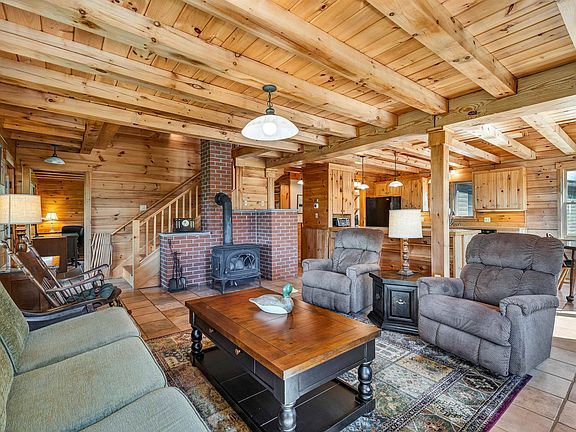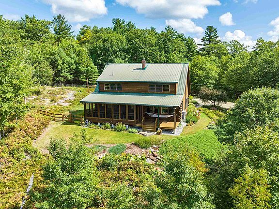 Log cabin warmth w timber-frame features combine to present a modern 3-bedroom homestead nestled peacefully within 687 acres of woodland perched on a south-facing slope of the Belknap Mountain Range. Built in 2000, this home exudes country living + features warm wood interiors; windows that welcome sunlight + extensive views; a brick hearth + chimney that reaches through an open staircase past timbered ceilings; + radiant heat in floor. Beyond the open concept living/dining/kitchen space, 3 bedrooms w ample closets, 2 nicely appointed bathrooms, bright laundry, welcoming mudroom, + spacious utility room that has been used for workshop, pet area, garden starter + freezer location. Additional storage is provided by walk-in closet/pantry, eave area, + 2-car attached garage w overhead. 10' x 40' porch offers both open + screened options complete w stunning view. Solar array assists to offset electric + oil expenses. Ornamental gardens, landscaping accents, fenced back yard w deck; woodshed; (2) ShelterLogic sheds; fenced organic garden. Plenty of area to accommodate pasture, greenhouses, livestock. On-site trails tie into 70 miles of publicly accessible trails within the Belknap Range w unique geology, myriad wildlife, panoramic views. Conservation easements secure the future stewardship of this land + guide its use for forestry, agriculture + recreation. 16-acre "House Area" subject to deed restrictions. A forest management plan is available. Retreat to NH's mountains + lakes.