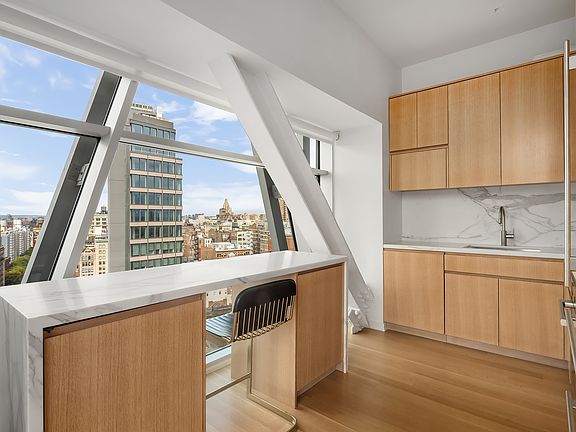 A private key-locked elevator delivers you directly into the residence, where you'll find soaring 13-foot ceilings, exposed beams, and walls of glass framing breathtaking panoramic views that stretch from the East River to the Chrysler Building, Empire State Building, and Freedom Tower.