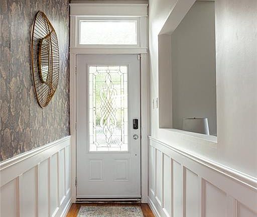 English gardenWhimsical wallpaperOriginal plank flooringBay windowElectric fireplaceStylish sconcesFrench doors