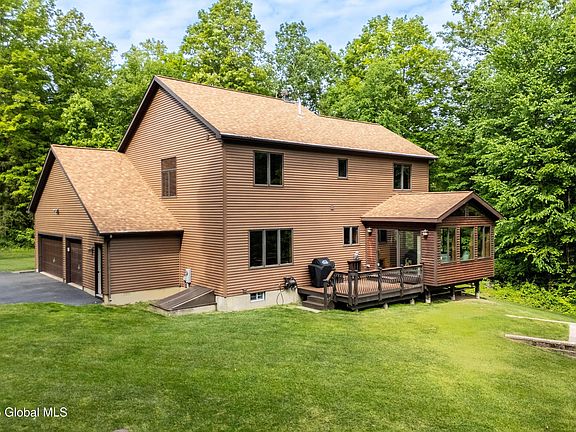 Beautiful secluded 3 Bedroom custom colonial situated on 6+ private acres just minutes away from Round Lake boat launch and the Village. Less then 200 foot walk to your private entrance to the Zim Smith trail for ALL recreational activities. Enjoy the Adirondack style 3 season room overlooking your private driving range of forever wild. Two story family room ceiling with a cozy wood burning stove. All this plus you are in the Shen School district! Many capital improvements completed within the past 8 years. Including a new roof, Furnace and A/C, 3 Season Sun Room,Composite Deck, Kitchen Appliances, Fresh paint, and Carpet throughout the upstairs.