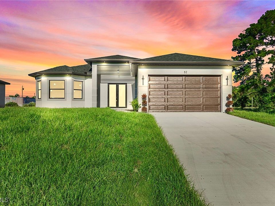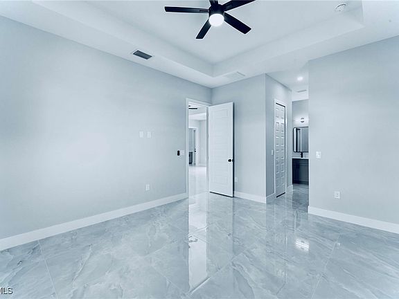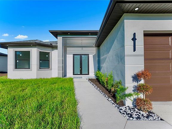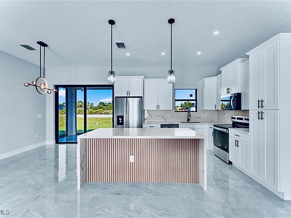 Welcome to this MARVELOUS (2025) BUILT completed 4/2 home nestled away on a DEAD-END street in the HIGHLY DESIRABLE SW side. This GRAND elevation with flattering DOUBLE FROSTED front doors has Multiple TRAY ceilings & 8ft utlimate interior Doors plus a decorative IRON ACCENT at entrance spotlights an impressive OVERSIZED porcelain tile throughout, gorgeous QUARTZ rainfall countertops & backsplash with an inviting Attractive SHIPLAP breakfast bar, STAINLESS STEEL appliances, and SOFT CLOSE SHAKER cabinets with crown molding. It is nicely landscaped including a stone perimeter and highlights IMPACT WINDOWS & DOORS, outstanding TILED walk-in showers with FRAME-LESS glass doors plus rainfall & multiple shower-heads including built-in niches, brilliant soffit lighting, awarding dual sink vanities, elegant bidets, excellent HIGH SPEED internet, and dazzling premium fixtures. It also features pendant & recessed lighting, an EPOXIED garage & entrance, custom mirrors, a built in cabinetry pantry, ideal pocket doors, generous dual closets in master, a Laundry vanity sink, and an epoxy picture framed SCREENED back patio great for entertaining. This property is NOT IN A FLOOD ZONE just minutes from all major amenities & a quick commute to Fort Myers! Schedule your showing today!