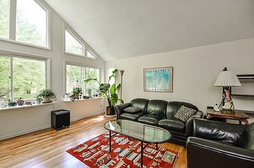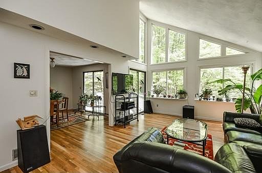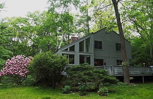 NATURE LOVER'S ONLY! This 3 bedroom contemporary is set on 3 wooded acres on a secluded country lane that looks like rural Vermont. Mature oaks & birches, abundant birds & close by trails make this an outdoor paradise. The house offers an open floor plan, cathedral ceilings, gleaming hardwood floors & many large windows with a spacious light filled living room, dining room, fireplaced family room & eat-in kitchen leading to large deck. The 2nd level includes a fireplaced master bedroom suite with bath & 2 other bedrooms & family bath. The finished lower level with full bath completes the living area. The interior is accented by natural woods, crisp white walls & lovely views from every room. This is a move-in ready home, off the beaten path, yet seconds from town center for easy commuting & shopping. Great opportunity to own a very special home in the highest rated school district that combines privacy and convenience!