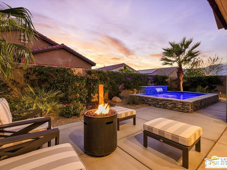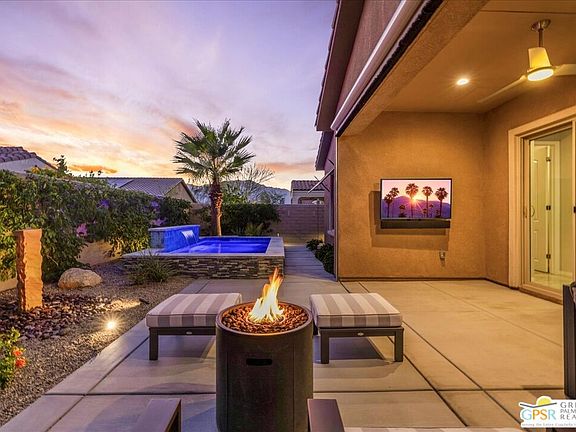 Refined Desert Living in Del Webb Rancho Mirage. Discover resort-inspired luxury in this beautifully appointed Phase 5, Plan 3 Expedition with Tuscan facade, ideally situated within the prestigious 55+ community of Del Webb Rancho Mirage. Thoughtfully designed with both comfort and sophistication in mind, this residence showcases a host of high-end upgrades and timeless finishes throughout. Step inside to find elegant tile flooring, upgraded carpet, custom window treatments, and designer Minka ceiling fans enhancing each room. The gourmet kitchen is a true centerpiece featuring upgraded cabinetry with modern brushed nickel hardware, a full tile backsplash, quartz countertops, stainless appliances, pantry, and a large island with ample seating - perfect for entertaining. Hand-selected pendant lighting and a reverse osmosis filtration system add refined touches to the space. The primary suite is a private retreat offering serene views of your backyard and raised spool. Details include a tray ceiling, upgraded LED lighting, and a luxurious ensuite with dual vanities, sconce lighting, a walk-in shower with bench, linen storage, and a walk-in closet with custom built-ins. The backyard is designed for effortless relaxation and entertaining, complete with a covered patio featuring a ceiling fan, zipper shades, and ambient lighting. A bubbling water fountain and raised spool with a waterfall feature create a tranquil ambiance, while peek-a-boo mountain views add a perfect desert backdrop. The guest suite, located on the opposite end of the home for added privacy, offers a spacious walk-in closet and access to a full bath. Additional highlights include a climate-controlled, insulated garage, upgraded architectural arch package, and Cat6 network wiring with Wi-Fi booster for seamless connectivity. Located just moments from the spectacular Del Webb clubhouse, residents enjoy access to world-class amenities including a resort-style pool and spa, fitness center, tennis and pickleball courts, bar, and an active social calendar - all within a secure, guard-gated setting. This home offers a perfect blend of luxury, privacy, and refined desert living in one of the Coachella Valley's most desirable 55+ communities.