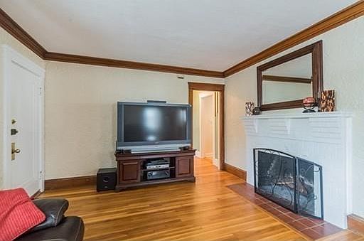 Harvard Lawn! This two bedroom condo features large living room with gumwood moldings, wood burning fireplace, built-in bookcases and sunroom/study. Eat-in kitchen with stainless steel appliances, newly renovated bathroom, master bedroom with deck, hardwood floors, patio and garage. Improvements include: Two year old roof, gutters, downspouts, and freshly painted in 2014. Close to green spaces, within walking distance to shops, cafes and bus service to Harvard Square make this one of Belmonts most diverse and exciting areas.