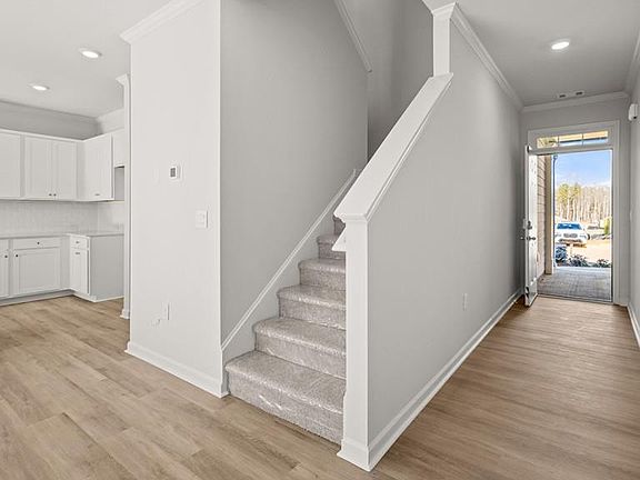 The new construction Salisbury plan at 54 Hughes Place Drive 2 story end-unit town home features 3 bedrooms and 2.5 bathrooms in 1,857 square feet along with a 2 car garage in new Dawsonville community, Hughes Court. As you step off the front porch, a long foyer welcomes you and leads into the open concept main living area. A large family room is the perfect place for family and friends to gather or for a quiet night with a book or movie. The family room flows seamlessly into the well-appointed kitchen with a center island, quartz counter tops, white subway tile back splash, sinclair burlap shaker-style cabinets and stainless steel appliances. A dining area directly off the kitchen provides space for a dining table and opens onto the back patio. There is also a half bathroom tucked way on the first floor. Up the stairs, you'll turn from the landing into the primary suite. This spacious bedroom is complimented by the en suite bathroom with separate tub and shower, dual vanity, water closet, linen closet and room walk-in closet. Across the landing you will be led into a loft area that is perfect for a game room, secondary living space or home office. 2 additional bedrooms, the laundry room and an additional bathroom with dual vanity round out the upper floor. Just minutes from Lake Lanier, homeowners can enjoy endless opportunities for outdoor recreation. With plenty of dining options, shopping centers and everyday conveniences nearby, Hughes Court offers a perfect balance of comfort and accessibility at 54 Hughes Place Drive.