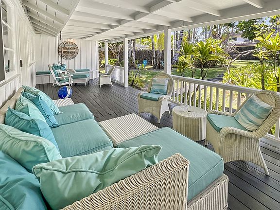 The home is equipped with split air conditioning for optimal temperature comfort in the main living area and bedrooms, with plenty of natural light and airflow that fills the space for an easy breezy tropical experience. Kai Mele is equipped with a full kitchen, as well as a dining area, and a living space that opens to the front and back yard. Guests can lounge in the added amenities of flat-screen televisions, high-speed Wi-Fi, and an in-unit washer and dryer. The spacious covered backyard lanai (porch) is furnished with various seating options from which guests can enjoy the spectacular view across the lush and expansive backyard towards idyllic ocean and peekaboo views of the Mokulua Island. Additionally, the backyard includes lounge chairs that are perfect for soaking up some Hawaiian sun, as well as a barbecue grill and outdoor dining area fit for cooking up a lovely meal. For early risers, enjoy your morning cup of coffee on the covered front porch while admiring the colorful displays of the famous Hawaiian sunrise.